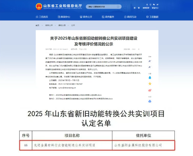 近日,山東省工業(yè)和信息化廳公示了《2025年山東省新舊動能轉(zhuǎn)換公共實訓(xùn)項目認(rèn)定名單》,山東盛陽金屬科技以“先進金屬材料行業(yè)智能制造公共實訓(xùn)項目”成功入選。