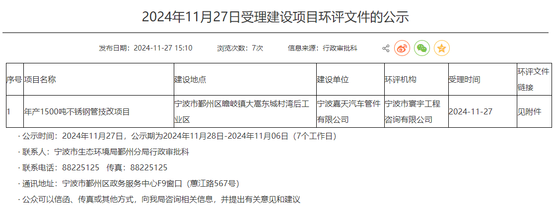 2024年11月27日,寧波市生態(tài)環(huán)境局鄞州分局受理寧波嘉天汽車管件有限公司年產(chǎn)1500噸不銹鋼管技改項目環(huán)境影響評價報告表并對外進(jìn)行公示,公示期:7個工作日。