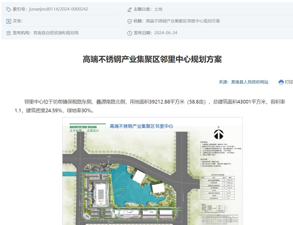 6月24日,莒南縣自然資源和規(guī)劃局公布高端不銹鋼產(chǎn)業(yè)集聚區(qū)鄰里中心規(guī)劃方案。