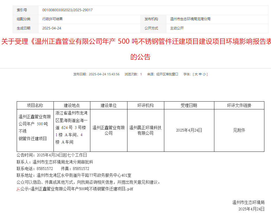 2025年4月24日,溫州市生態(tài)環(huán)境局受理《溫州正鑫管業(yè)有限公司年產(chǎn)500噸不銹鋼管件遷建項(xiàng)目建設(shè)項(xiàng)目環(huán)境影響報(bào)告表》并對(duì)外進(jìn)行公告,公告時(shí)間:2025年4月24日起七個(gè)工作日。