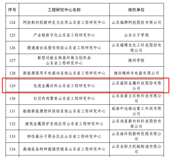 7月8日,山東省發(fā)展和改革委員會發(fā)布了《關于公布2024年認定山東省工程研究中心名單的通知》,山東盛陽金屬科技股份有限公司申報的“先進金屬材料山東省工程研究中心”成功獲批。