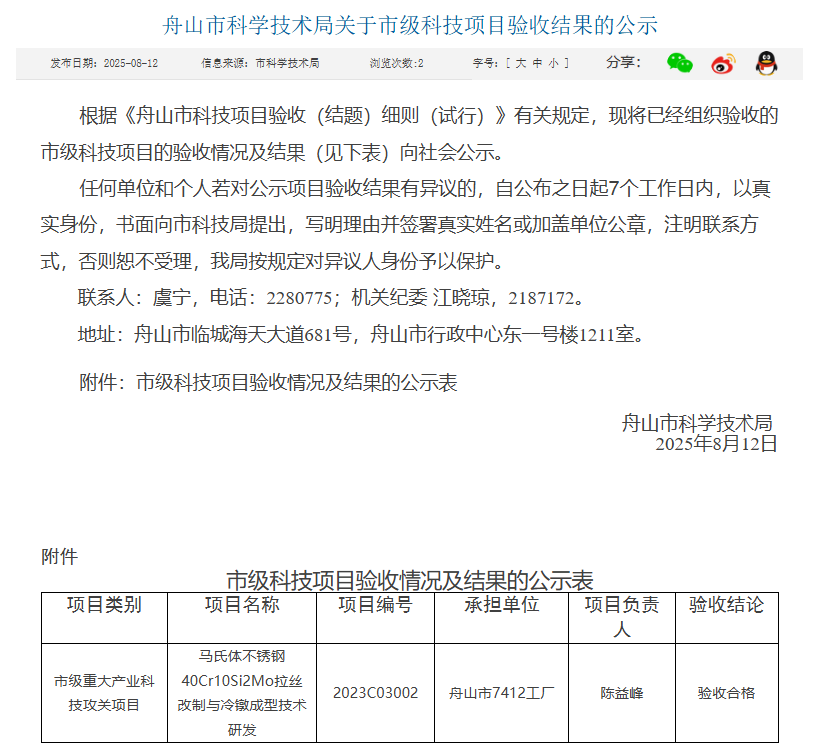 2025年8月12日,舟山市科學(xué)技術(shù)局將市級科技項(xiàng)目驗(yàn)收結(jié)果對外進(jìn)行公示,公示期:7個(gè)工作日。