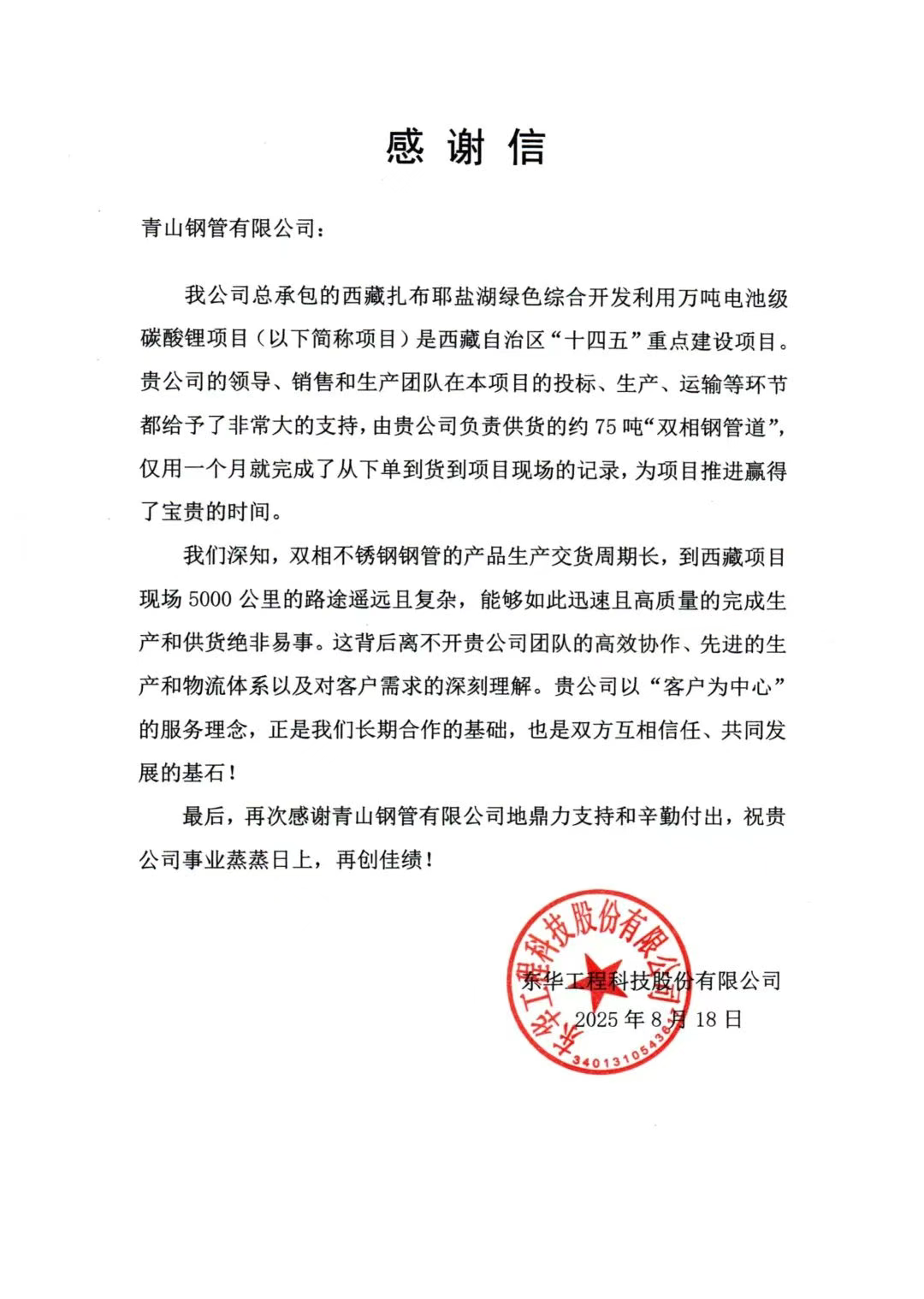 近日,青山鋼管有限公司收到東華工程科技股份有限公司發(fā)來的感謝信,對公司在西 藏扎布耶鹽湖綠色綜合開發(fā)利用萬噸電池級碳酸鋰項目中的卓越表現予以高度肯定。