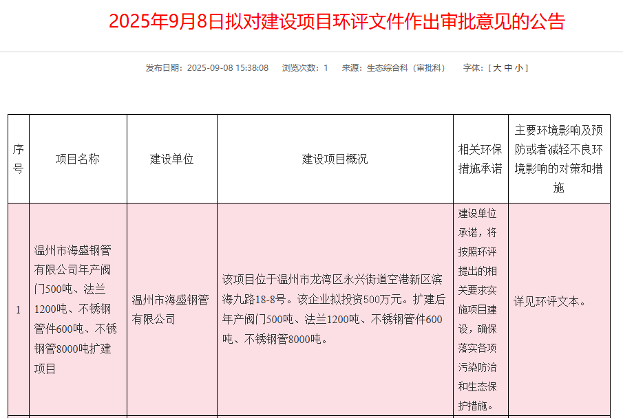 2025年9月8日,溫州市生態(tài)環(huán)境局龍灣分局就溫州市海盛鋼管有限公司年產(chǎn)閥門(mén)500噸、法蘭1200噸、不銹鋼管件600噸、不銹鋼管8000噸擴(kuò)建項(xiàng)目環(huán)境影響評(píng)價(jià)報(bào)告表作出審批意見(jiàn)并對(duì)外進(jìn)行公告,公告期:5個(gè)工作日。